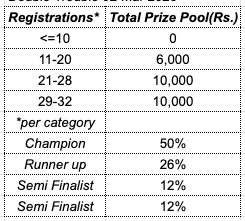 -All registered players/teams of a category are grouped in to 4 or 8 groups. (4 groups for≤16 participants & 8 groups for >16 participants). i.e. each group is of size maximum 4 players.